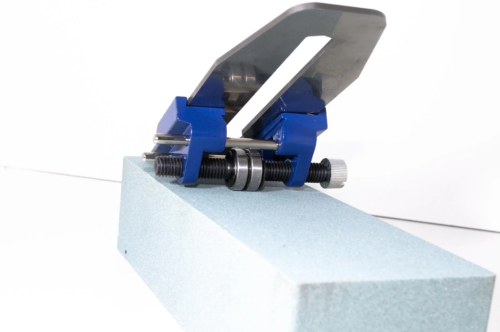 Esta guía de bruñido, arriba, parece simple y pequeña, pero ofrece un rendimiento descomunal, sosteniendo firmemente hojas y formones de hasta 2-5/8" de ancho, lo que cubre la mayoría de las herramientas que usamos. El rodillo único se equilibra bien y las mordazas proporcionan un buen agarre.